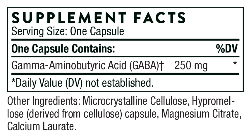 PharmaGABA-250 features a natural source of the inhibitory neurotransmitter – GABA. GABA supports restful sleep, acts as a "brake" on stress, and promotes a focused but calm state of mind.* Clinical studies show this natural form of GABA in Thorne's PharmaGABA can decrease the brain's stress-related beta waves and increase the production of alpha-waves, creating a profound sense of physical relaxation while maintaining mental focus.* Other studies show reduced pupil diameter and heart rate, and a reduction in the levels of two natural biomarkers of stress – salivary cortisol and chromogranin A – all signs of enhanced relaxation.*