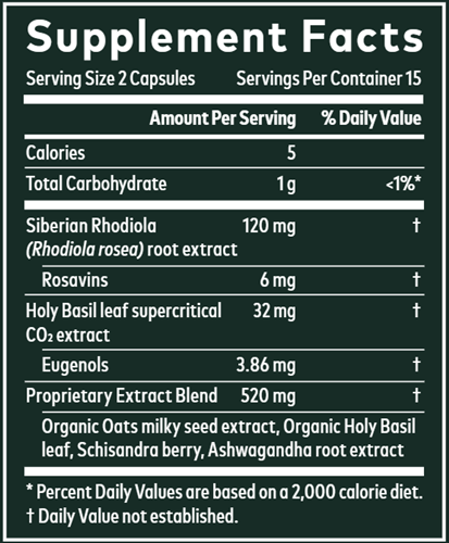 Each 2-capsule serving delivers 6 mg rosavins and 3.86 mg eugenols.
