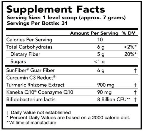 SunSpectrum™ combines soluble prebiotic Sunfiber® with high-quality branded sources of Tumeric, Curcumin and Coenzyme Q10 along with a proven probiotic strain.