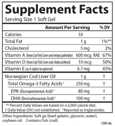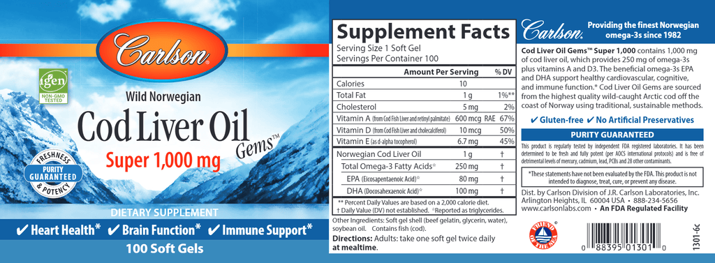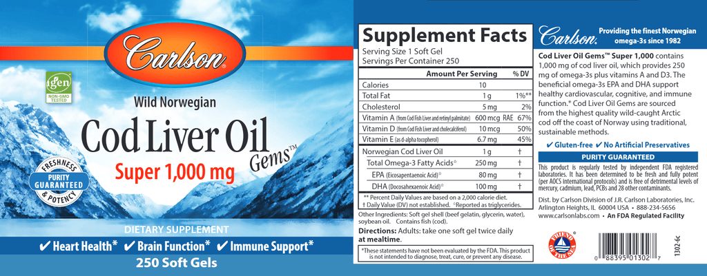 Cod Liver Oil Gems, Super 1,000 mg contain 1,000 mg of Norwegian cod liver oil per soft gel, providing the important omega-3s EPA and DHA, which support heart, brain, vision, and joint health. It also offers 2,000 IU of vitamin A and 400 IU of vitamin D3. To ensure maximum freshness, Cod Liver Oil, Super 1,000 mg is closely managed from sea to store.