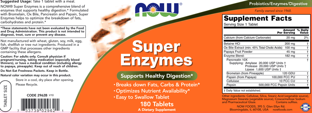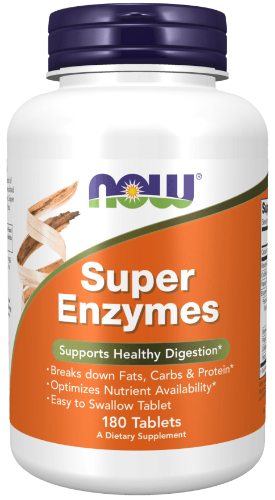 NOW® Super Enzymes is a comprehensive blend of enzymes that supports healthy digestion.* Formulated with Bromelain, Ox Bile, Pancreatin and Papain, Super Enzymes helps to optimize the breakdown of fats, carbohydrates and protein.*