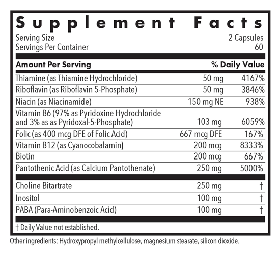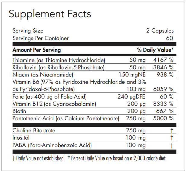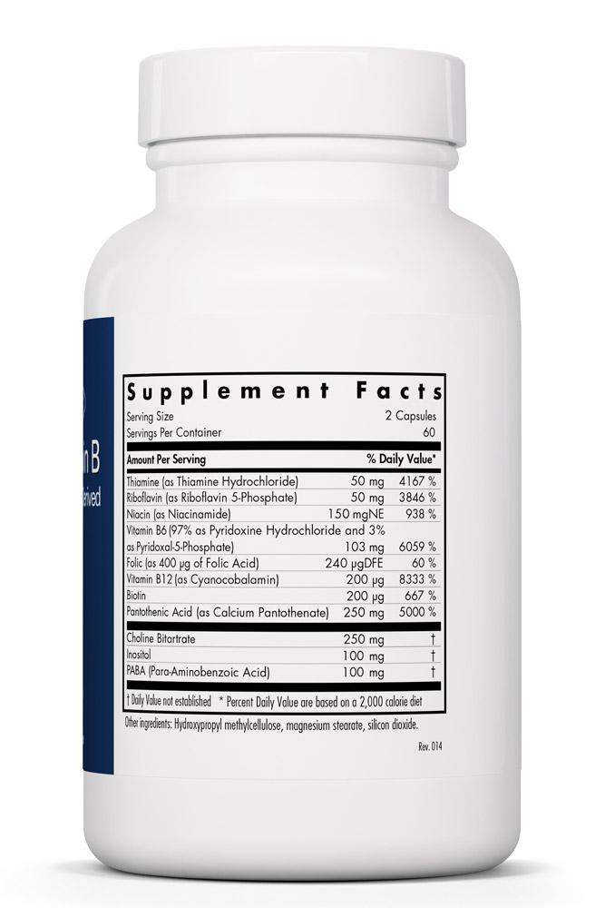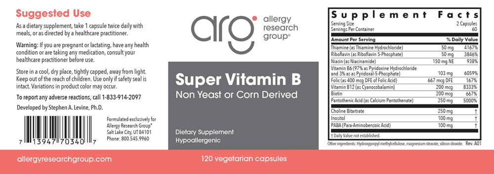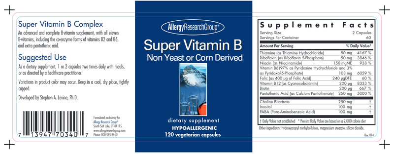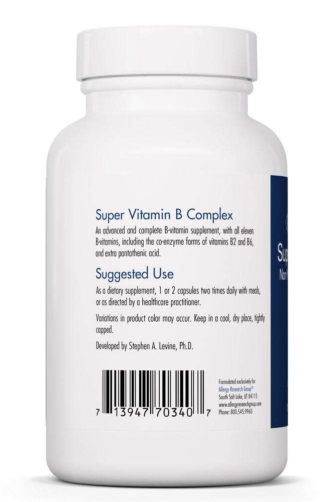 B-vitamin complex with co-enzyme forms of B2 and B6 and extra pantothenic acid. Super Vitamin B Complex is an advanced and complete B-vitamin supplement. It provides substantial amounts of all eleven B-vitamins, including the co-enzyme forms of vitamins B2 and B6 for enhanced bioavailability, and extra pantothenic acid.* The B vitamins in this formula are synthesized from hydrocarbons, which originate ultimately from living sources, with very low allergy potential.*