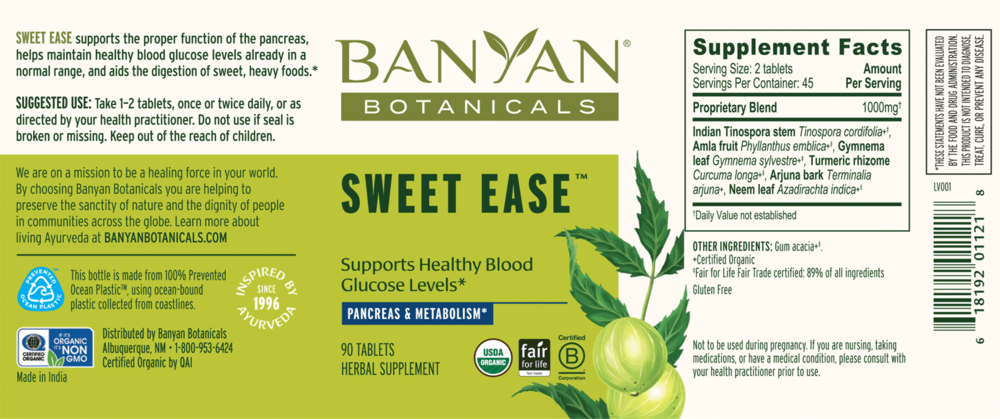 Sweet Ease is a kapha-reducing formula created to support healthy blood sugar levels and the proper function of the pancreas. Shardunika, a main ingredient, is known as "the destroyer of sweet." Modern studies suggest that it helps the pancreas maintain healthy blood sugar levels already in the normal range by supporting the production of insulin. Along with shardunika, Sweet Ease combines other Ayurvedic herbs like neem and turmeric that have been used together for centuries to support the pancreas and to help the body digest sweet, unctuous, and heavy substances. This formula also bolsters the immune system while toning the urinary tract and supporting healthy urination.
