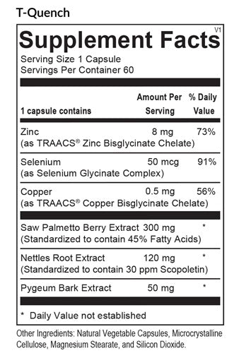 Our hormones are chemical messengers that dictate everything from metabolism to hair growth. Aging, stress levels, and even diet can alter hormonal balance. T-Quench utilizes powerful botanicals as well as important minerals to target hormone conversion, helping to maintain a balanced and well-regulated hormonal system.