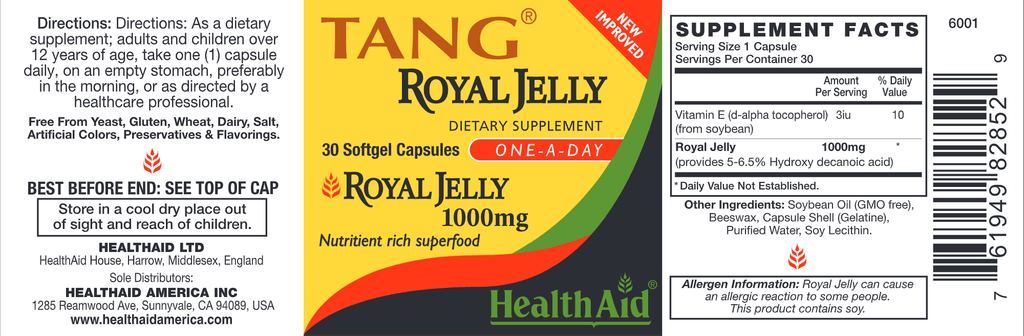 Tang Royal Jelly provides over 1000mg of fresh royal jelly, prepared in a base of wheatgerm oil, a powerful antioxidant* naturally containing vitamin E, which acts as a preservative to maintain freshness and stability. Tang Royal Jelly provides 5%-6.5% of hydroxyl decanoic acids that are the active components of Royal Jelly.