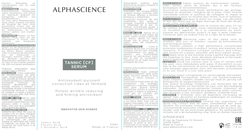 TANNIC CF SERUM is clinically proven to make the appearance of wrinkles less visible, skin firmer and redness less visible. This serum helps to diminish the appearance of photodamage and also redness. It smoothes the appearance of fine lines and improves texture and tone, resulting in a clearer and healthier looking complexion. TANNIC CF SERUM integrates the most advanced antioxidant combination of Vitamin C in high concentration with active ingredients such as Tannic Acid, Ferulic Acid and Ginkgo Biloba concentrate.