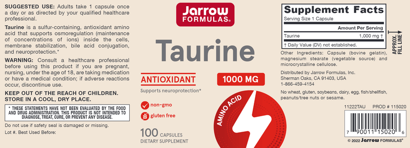 Taurine is a sulfur-containing, antioxidant amino acid that supports osmoregulation (maintenance of concentrations of ions) inside the cell, membrane stabilization, bile acid conjugation, and brain function.*