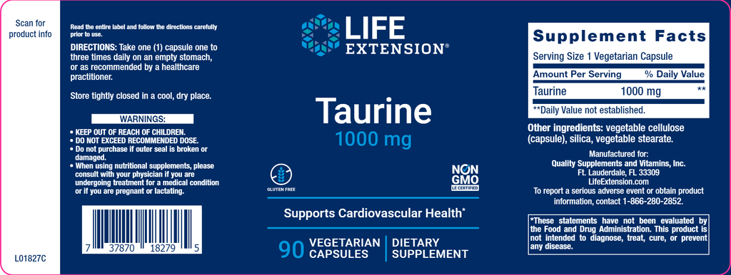 Taurine is one of the most abundant amino acids in the body. It supports a healthy heart and brain, muscle mass and exercise performance. Life Extension's Taurine supplement provides 1,000 mg of taurine per capsule.
