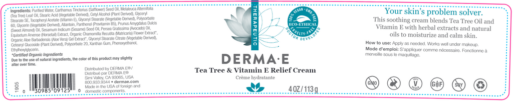 Purified Water, Carthamus Tinctorius (Safflower) Seed Oil, Melaleuca Alternifolia (Tea Tree) Leaf Oil, Stearic Acid (Vegetable Derived), Cetyl Alcohol (Plant Derived), Glyceryl Stearate SE, Tocopheryl Acetate (Vitamin E), Glyceryl Stearate (Vegetable Derived), Polysorbate 60, Glycerin (Vegetable Derived), Allantoin, Panthenol (Provitamin B5), Prunus Amygdalus Dulcis (Sweet Almond) Oil, Sesamum Indicum (Sesame) Seed Oil, Persea Gratissima (Avocado) Oil, Equisetum Arvense (Horsetail) Extract, Organic Chamomilla Recutita (Matricaria) Flower Extract*, Organic Aloe Barbadensis (Aloe Vera) Gel Extract*, Glyceryl Stearate Citrate (Vegetable Derived), Cetearyl Glucoside (Plant Derived), Polysorbate 20, Xanthan Gum, Phenoxyethanol, Ethylhexylglycerin.