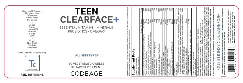 Codeage Teen Clearface is an all-in-one formula for teenagers ages 12-18 featuring vegan vitamin A as natural Beta-Carotene, vitamin C, vitamin D3 from wild-harvested lichen, and vitamin E from rice bran. This face and skin supplement features vitamins, minerals, probiotics & amino acids that can be used for all skin types including oily skin, and as part of a beauty regimen.