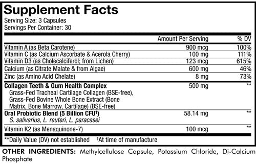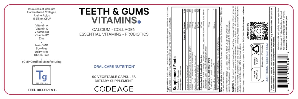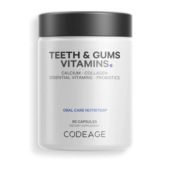 Codeage Teeth & Gums is an all-in-one vitamin for teeth and gums featuring multivitamins, plant-based calcium, collagen, probiotics, phosphorus, potassium, and zinc. This premium formula also offers 500 mg of Collagen complex and includes vitamin A, vitamin C, vitamin D3 and vitamin K2. plus it offers essential vitamins, a collagen complex, and a dental probiotic blend that are important to the health of your teeth and gums.