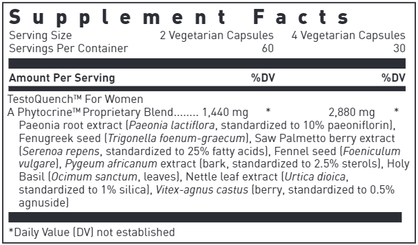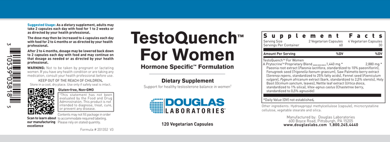 TestoQuench for Women, provided by Douglas Laboratories is a Hormone Specific Formulation of antiandrogens and androgen antagonists. This combination is designed to support the healthy function of skin, hair, heart, breasts, vagina and other testosterone sensitive tissues in women.