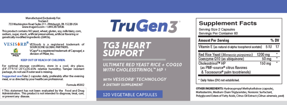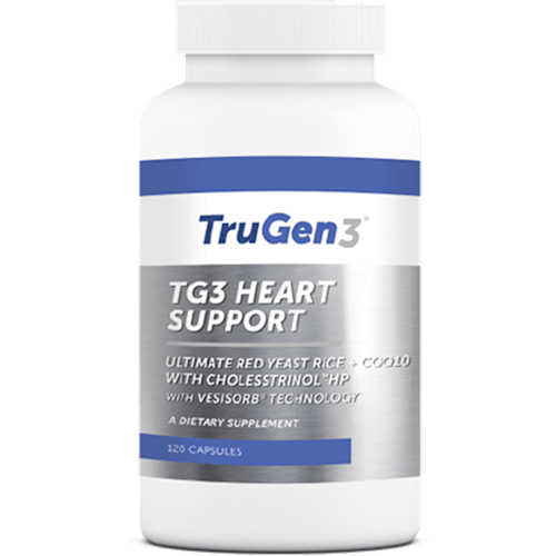 TG3 Heart Support, supplied by TruGen3®, is a special combination of coenzyme Q10, red rice yeast and Cholesstrinol™ HP, a proprietary blend of citrus flavones and palm tocotrienols, uniquely developed with the superior VESIsorb® colloidal delivery system to provide optimal absorption and utilization by the body.