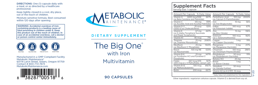 The Big One® with Iron provides a solid framework for further individualized supplementation. Combine it with any Metabolic Maintenance calcium and magnesium formula, additional antioxidants, CoQ10, and/or Omega 3s.