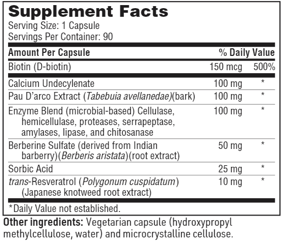 This powerful phytonutrient complex was designed to help restore and maintain healthy gastrointestinal and vaginal balance, as well as harmonize microbiota populations.† Along with undecylenic acid, this formula also provides berberine and other synergistic factors.