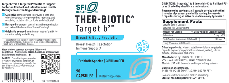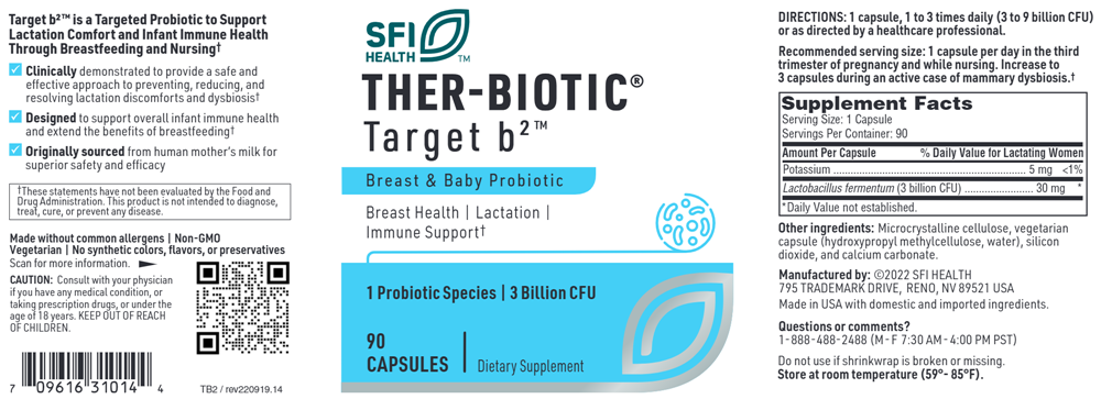 Ther-Biotic® Target b2™ is a targeted probiotic designed to extend the benefits of breastfeeding and support overall infant immune health.† This strain of Lactobacillus fermentum is clinically demonstrated to support breast health and resolve discomfort associated with mammary dysbiosis.† As many as one-third of lactating women experience significant discomfort resulting in premature cessation of breastfeeding. Studies have shown that lactic acid bacteria isolated from human milk may prevent and resolve lactation-associated mammary dysbiosis.† Colonizing Lactobacilli were isolated from the breast milk of healthy mothers. The strain was specifically selected for its safety of origin, antimicrobial, and immunomodulatory properties. It is recommended to start supplementation with one capsule of Ther-Biotic® Target b2™ in the third trimester of pregnancy and continue while nursing to help prevent mammary dysbiosis.† During an active case of mammary dysbiosis, three capsules at 9 billion CFU are recommended.†