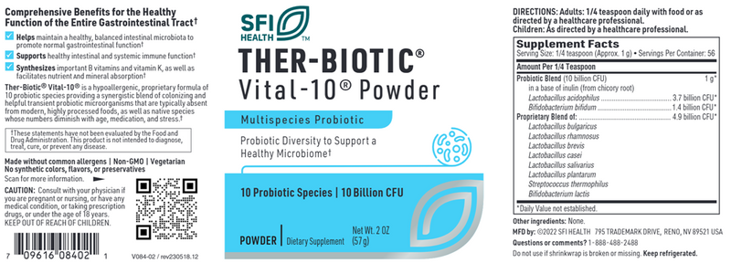 Ther-Biotic® Vital-10® provides a synergistic blend of indigenous, essential colonizing, and beneficial transient probiotic microorganisms. The Lactobacillus species normally predominate in the small intestine while the Bifidobacterium species are important for the colon. Vital-10® supplies beneficial probiotic organisms generally not present in modern, highly processed foods together with indigenous species whose numbers decline with age, medication, and stress. Two transient yogurt starter species with long histories of health benefits are blended into the formulation. Together they maintain a healthy, balanced intestinal microbiota, promote normal gastrointestinal function, synthesize B vitamins and vitamin K, facilitate nutrient and mineral absorption, and support normal intestinal and systemic immune functions.†