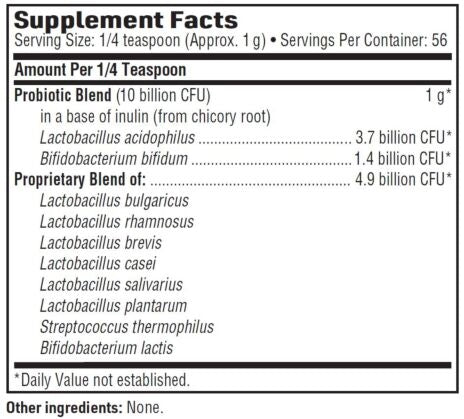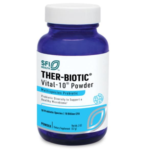 Vital-10® is available in both a high-strength powder providing 10 billion CFUs per 1/4 teaspoon and a maintenance-serving size vegetarian capsule supplying 5 billion CFUs.