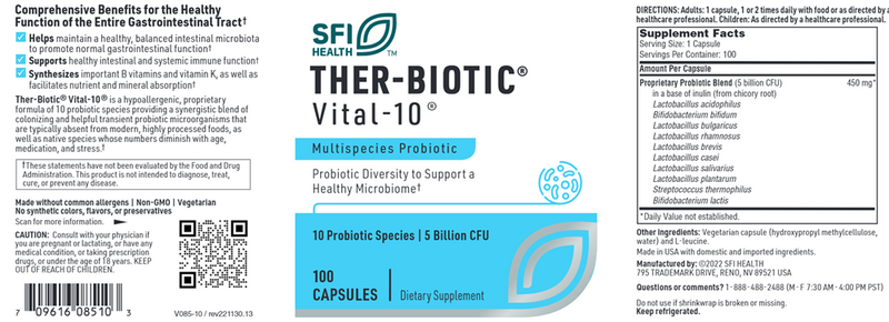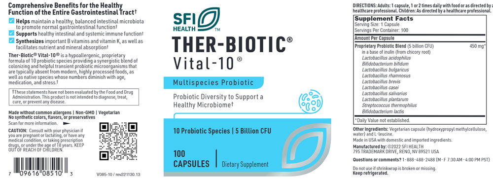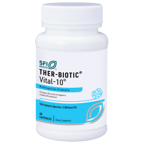 Ther-Biotic® Vital-10® is a cost-effective, multispecies probiotic formula especially useful for maintaining a healthy microbiota balance in people with normal gastrointestinal function and for maintenance supplementation in individuals following more aggressive probiotic supplementation with higher strength preparations or more targeted probiotic blends.†