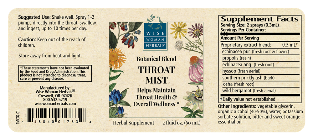 Our Wise Woman Herbals® Throat Mist is perfect for the busy, on-the-go and health conscious person searching for ways to support normal healthy throat function and ease mild temporary dryness and irritation. With our proprietary blend of echinacea, hyssop and prickly ash bark, our Throat Mist is one of our more popular immune support products. Our convenient spray delivers fast, convenient and potent liquid extracts directly to improve your throat function.