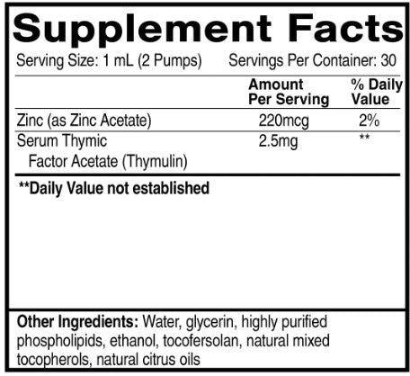 Thymulin Zinc Complex is an advanced immune and longevity formulation delivering the naturally occurring bioactive peptide thymulin in a highly absorbable oral liposomal format. Designed to support thymic renewal and healthy immune signaling, this formula combines thymulin, a key thymic peptide essential for T-cell differentiation, maturation, and immune balance - with zinc, a vital cofactor required for thymulin’s biological activity and stability.