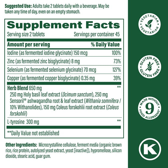 A healthy thyroid means healthy metabolism—and a healthy mood, mental focus and cardiovascular system!* MegaFood Thyroid Strength® combines thyroid-supporting FoodState® minerals with L-tyrosine, Sensoril® ashwagandha and other herbal extracts to support thyroid health.*