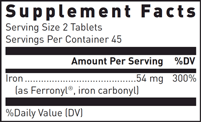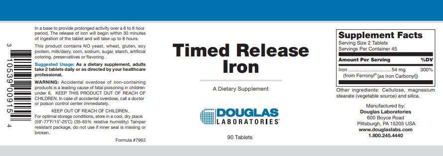 Timed Release Iron tablets, supplied by Douglas Laboratories®, are specially designed to provide 54 mg of carbonyl iron (Ferronyl®) per serving for a 6 to 8 hour period. Carbonyl iron is easily absorbed and has a low toxicity.
