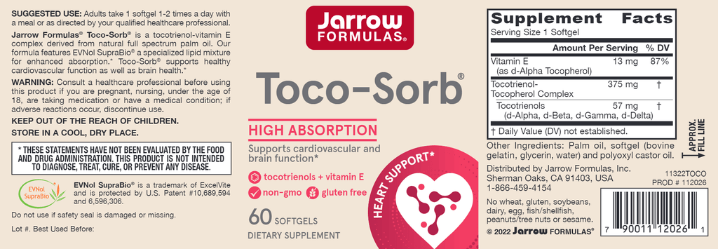 Toco-Sorb® tocotrienol-vitamin E complex utilizes SupraBio™ enhanced absorption system. Tocotrienols support cardiovascular structure and function.* Toco-Sorb® also supports healthy brain structure and function.*
