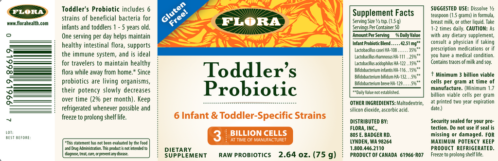 Take a proactive approach to supporting your child’s gastrointestinal health by providing beneficial gut flora with Flora’s Toddler’s Probiotic.* Lifestyle and environmental factors can compromise the digestive system, but adding probiotics into the dietary mix can help boost the good bacteria, and helping to maintain a healthy microflora, naturally.* Flora’s Probiotic Blends are unique in that they’ve been developed to survive the stomach acids so that they can be as effective as possible when they reach the intestinal tract.*