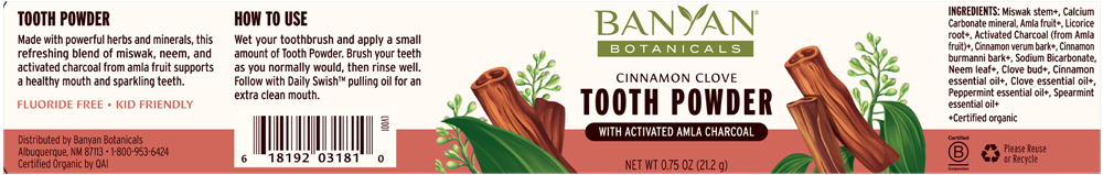 Miswak+, Calcium Carbonate, Amalaki+, Licorice+, Activated Charcoal+, Baking Soda, Neem+, Cinnamon+, Clove+, Spearmint essential oil+, Peppermint essential oil+, Clove essential oil+, Cinnamon essential oil+.