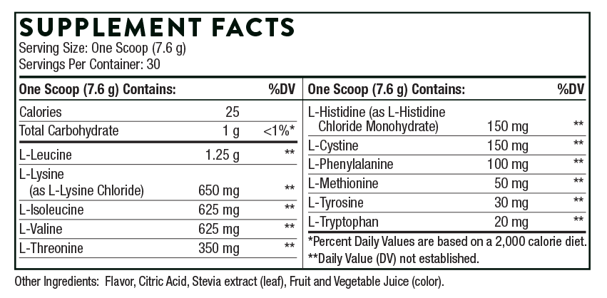 Amino Complex contains a high amount of branched-chain amino acids in a formula that has been validated through numerous clinical trials for promoting lean muscle mass and muscle strength.* The branched-chain amino acids in Amino Complex promote mitochondrial biogenesis, which provides energy to the cells.* Amino acid supplementation has also been shown to decrease fat synthesis and promote energy production.* Thorne’s Amino Complex is available in either lemon or berry flavor and provides 7.6 grams of branched-chain and essential amino acids per serving.