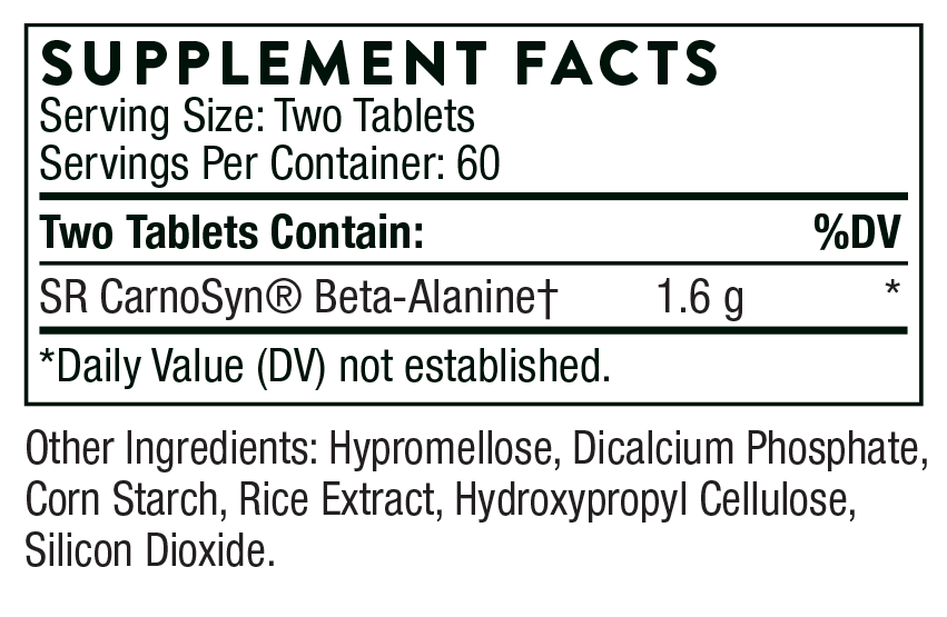 Beta Alanine-SR is required for the body to make carnosine, which is responsible for buffering the hydrogen ions created during energy production in the muscles.* Carnosine helps maintain normal acidity levels in the muscles, because acidity is a major contributor to muscle fatigue. Supplementing with beta alanine supports muscle health, muscle work capacity, and perceived time-to-exhaustion in both anaerobic exercise that lasts 1-4 minutes and aerobic exercise that lasts longer than four minutes.* Beta alanine has also been shown to benefit athletic performance.* For example, studies have shown improvements in fatigue in cyclists, in 2,000-meter rowing time trials, in strength in college football athletes, and in sprint performance in endurance cyclists.* Two tablets of Thorne’s Beta-Alanine-SR contain 1.6 grams of sustained-release beta-alanine (as CarnoSyn®).