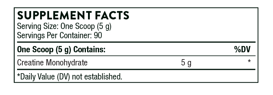 Creatine plays an important role in the production of cellular energy because it helps the body make ATP, the molecule needed by all of the body’s cells and the one that has been shown to support increased work capacity and power output of muscle while also promoting physical endurance and lean body mass gain.* Each serving of Thorne’s Creatine contains 5 grams of creatine monohydrate.