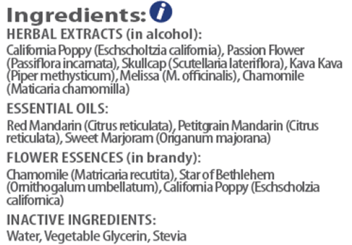Ingredients: Herbal Extracts (in alcohol): California Poppy (Eschscholtzia california), Passion Flower (Passiflora incamata), Skullcap (Scutellaria lateriflora), Kava Kava (Piper methysticum), Melissa (M. officinalis), Chamomile (Maticaria chamomilla)