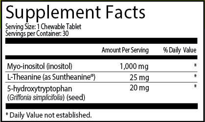 Tranquilent™ includes ingredients that support the action of inhibitory neurotransmitters.* 5-HTP supports serotonin synthesis.* Myo-inositol works to support serotonergic receptors.* Theanine, as Suntheanine®, supports both the release of GABA and its function.*
