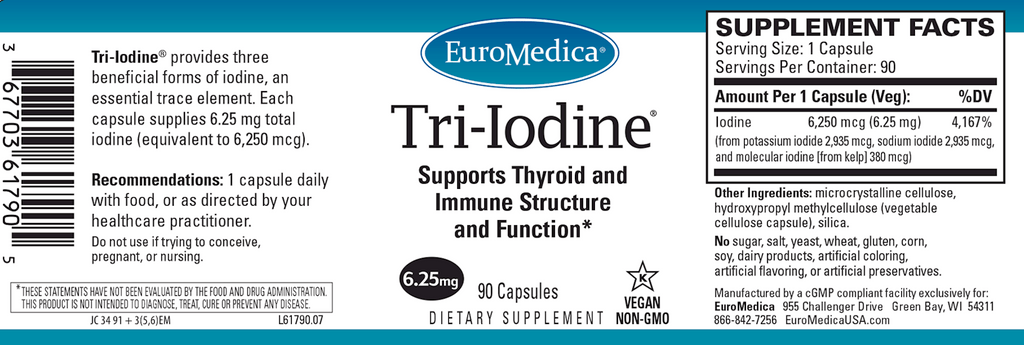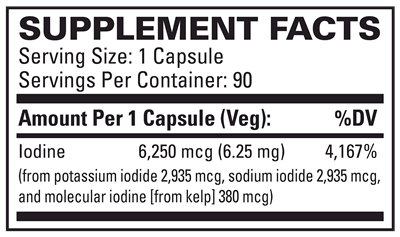 Tri-Iodine® provides three beneficial forms of iodine, an essential element. Available in two strengths for targeted supplementation: 6.25 mg total iodine (equivalent to 6,250 mcg), and 12.5 mg total iodine (equivalent to 12,500 mcg) per capsule. Optimal levels of iodine are imperative to many systems in the body including:
