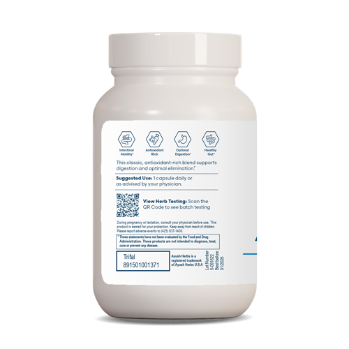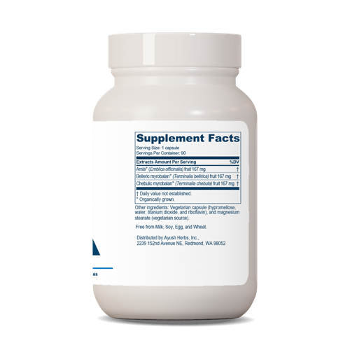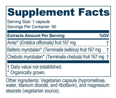 TRIFAL™ is a combination of three herbs – Terminalia chebula (Haritaki), Terminalia belerica (Bahera), and Emblica officinalis (AMLAOXY®). This combination is referred to in almost every Ayurvedic textbook and is considered to be adaptogenic. This combination has synergistic action, and provides digestive and elimination support. It is also considered to have antioxidant properties. Terminalia chebula contributes tannins, amino acids, succinic acid, and beta-sitosterol. Emblica officinalis supports the immune system and is one of the best known sources of ascorbinogen. Trifal™ has bowel-regulating properties and is excellent for relief of occasional constipation, while aiding both digestion and elimination. The herbal combination in Trifal has long been considered a secret of longevity and robust health in Ayurvedic practice. Triphala has also been used in Ayurveda to promote healthy eyes.