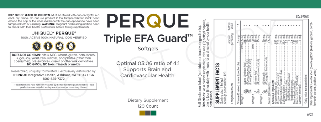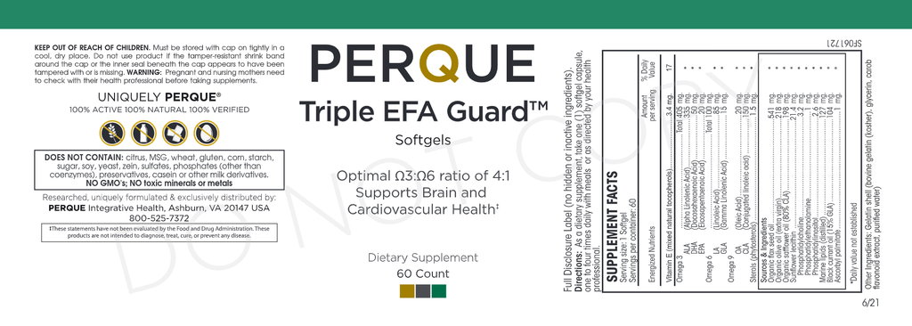 PERQUE Triple EFA Guard™ contains the best balance (4:1) of omega-3 to omega-6 essential fatty acids (EFAs), along with the beneficial omega-9 EFA and the most potent docosahexaenoic acid (DHA)/ conjugated linolenic acid (CLA) combination. Finally, a product with the essential oils you need.