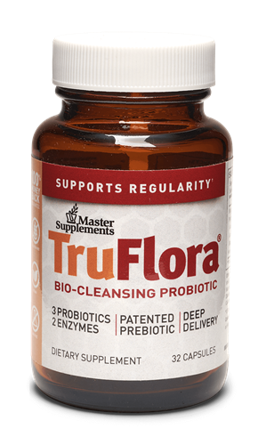 TruFlora is a high potency BIO-CLEANSING PROBIOTIC containing 3 Lactobacillus strains and 2 beta-glucan digesting enzymes protected by U.S. Patents 7, 122, 370 and 7, 229, 818 that assure viable delivery through stomach acid.