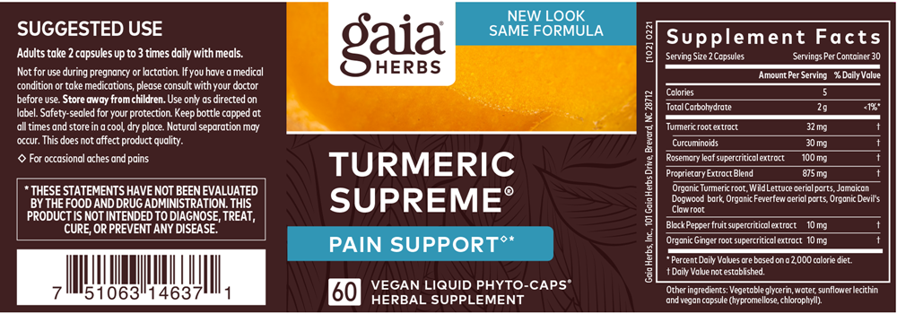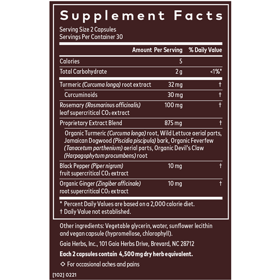 Combines Turmeric with other herbal extracts to support a healthy pain response. Feverfew, Devil’s Claw, and Ginger have each been studied for their role in supporting the body’s reaction to occasional pain. Black Pepper extract is included for increased absorption and bioavailability of Curcumins.