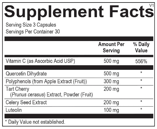 Quercetin Dihydrate: Quercetin is an important dietary polyphenol, a family of micronutrients that includes flavonoids, which have potent antioxidant properties and help to maintain normal inflammatory balance. It also acts as an immune regulator that may reduce the development of cellular oxidative damage. Quercetin is found in a variety of botanicals as well as vegetables and fruits, including apples, berries, onions, broccoli, and green leafy vegetables. Quercetin inhibits advanced glycation end products (AGEs), which are harmful oxidative byproducts formed in the body because of overactive chemical reactions. Most importantly, quercetin has been shown to inhibit the actions of xanthine oxidoreductase (XOR), which is the rate-limiting step in the body’s production of uric acid. In a prominent 2016 study of healthy adults, a month of daily quercetin at 500 mg resulted in significantly lowered uric acid levels. Additionally, a study of individuals at risk for cardiovascular challenges showed a statistically significant effect of quercetin supplementation in maintaining blood pressure within the normal range.