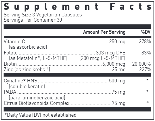 Ultra HNS contains a clinically studied solubilized keratin called Cynatine® in combination with bioavailable methylfolate, biotin, zinc and vitamin C, to support the strength and appearance of healthy hair, nails, and skin. This formula also provides antioxidant protection to help enhance skin health and barrier function.