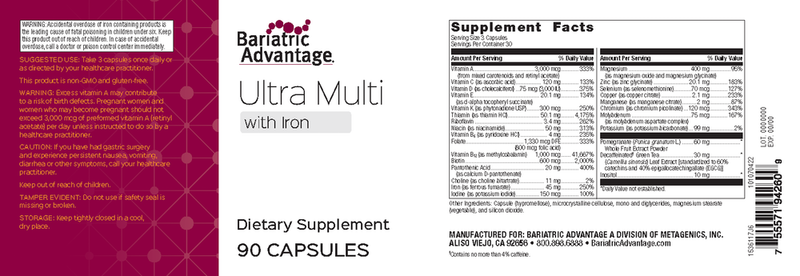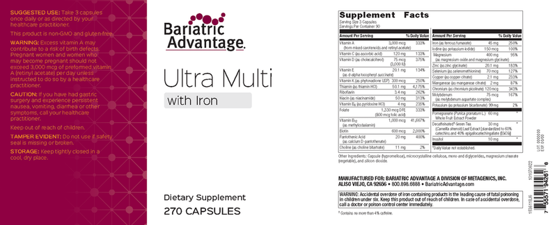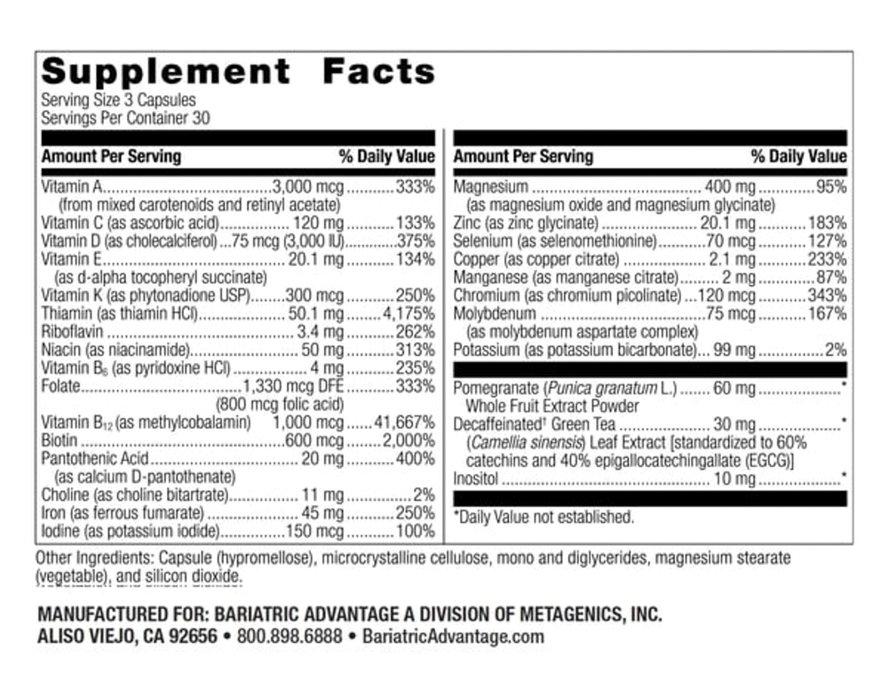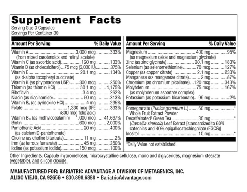 Bariatric Advantage Ultra Multi is our highest potency multivitamin with a three-capsule serving. It is ideal for those who are looking for divided doses throughout the day.