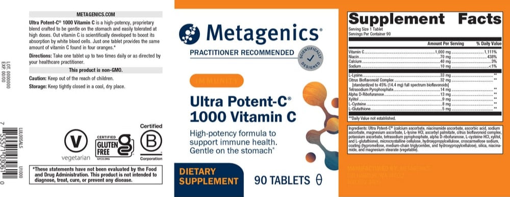 Ultra Potent-C® 1000 Vitamin C is a high-strength vitamin C supplement designed to support your immune system every day.* Each easy-to-take tablet delivers 1000 mg of vitamin C—about the same as you'd get from four oranges—plus key nutrients like bioflavonoids, L-lysine, and glutathione to enhance absorption and effectiveness.*
