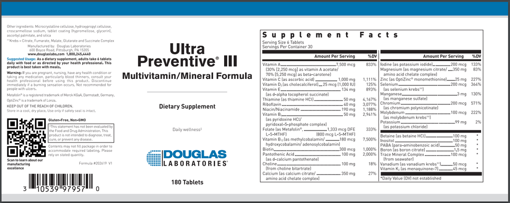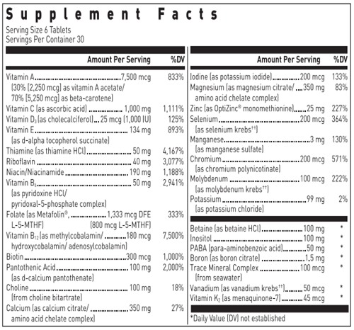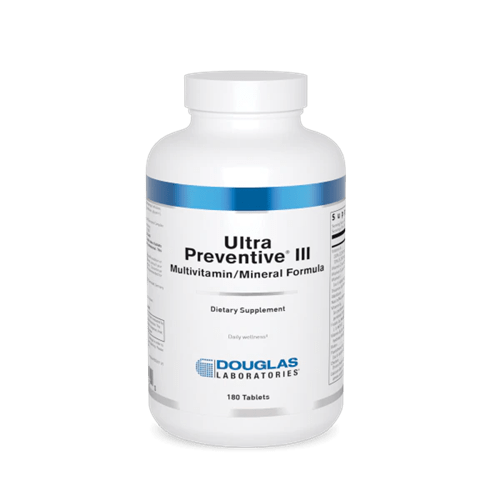 Ultra Preventive® III provides a comprehensive vitamin/mineral/trace element formula with bioavailable nutrient forms to support optimal health and wellness. Featuring Vitamin K2 for bone and vascular health, three forms of vitamin B12 for mitochondrial energy and methylation support, Metafolin® L-5-MTHF folate and choline for the homocysteine-methionine cycle, and antioxidants for immune and cellular health.‡