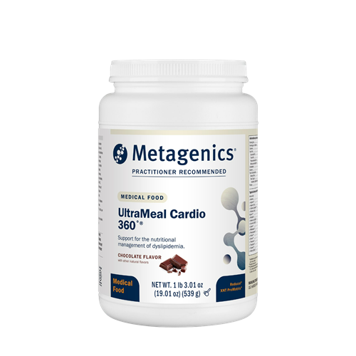 UltraMeal Cardio 360°® is a medical food formulated to provide specialized nutritional support within a nutritional management program for dyslipidemia by supplying a combination of phytosterols, bioavailable xanthohumol from hops (XNT ProMatrix®), beneficial macronutrient profile, 5 g of prebiotic isomalto-oligosaccharides, antioxidant nutrients (vitamins C and E), and a proprietary pea/rice protein base with added amino acids. As part of a heart healthy eating plan the addition of 1.8 g/day of plant sterols/stanols has been shown to lead to beneficial changes in LDL cholesterol in individuals with hypercholesterolemia.