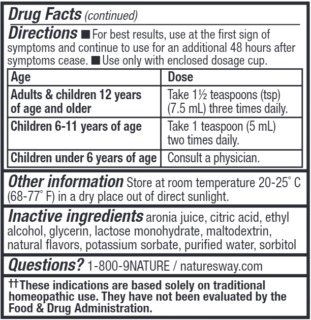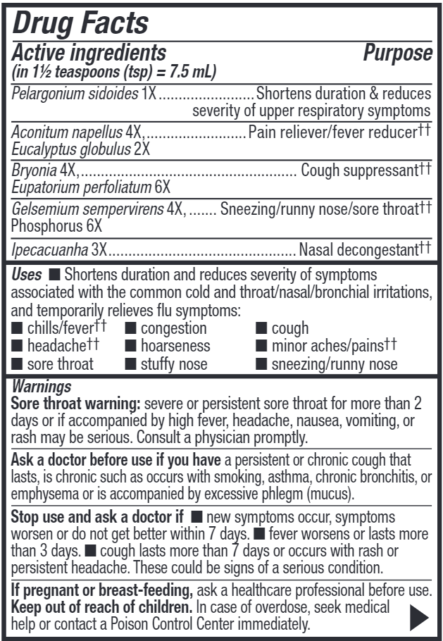For best results, use at the first sign of symptoms and continue to use for an additional 48 hours after symptoms cease. Use only with enclosed dosage cup. Shake well before each use. Adults & children 13 years of age and older: Take 1 1/2 teaspoons (tsp) (7.5 mL) three times daily. Children 6-12 years of age: Take 1 teaspoon (5 mL) three times daily. Children under 6 years of age: Consult a doctor.