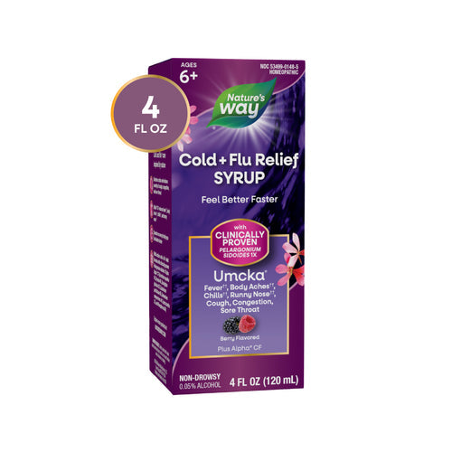 Don’t just soothe your cold and flu†† symptoms — alleviate them with Nature's Way Cold + Flu Relief Syrup. It shortens duration and reduces severity of symptoms associated with the common cold and throat/nasal/bronchial irritations. Our Alpha® CF blend provides multi-symptom relief of colds and flu.†† Non-drowsy. For ages 6+.