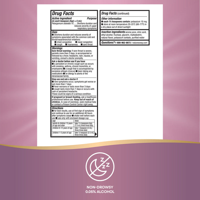 Sore throat warning: if sore throat is severe, persistent for more than 2 days, or is accompanied or followed by a fever, headache, rash, nausea, or vomiting, consult a doctor promptly. Ask a doctor before use if you have a persistent or chronic cough such as occurs with smoking, asthma, chronic bronchitis, or emphysema; a cough that is accompanied by excessive phlegm (mucus); been taking any medications; an allergy to plants in the Geraniaceae family.