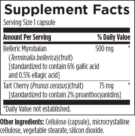 T. bellerica is a deciduous tree native to Southeast Asia whose fruit and kernel oil have been used for centuries in Ayurvedic and ancient Greek medical traditions and is used today to support healthy uric acid metabolism.* Tart cherries contain high levels of anthocyanins, polyphenolic compounds that may help support the body’s antioxidant status.* Tart cherries also help to promote the urinary excretion of uric acid and thus, less absorption of uric acid in the body.*